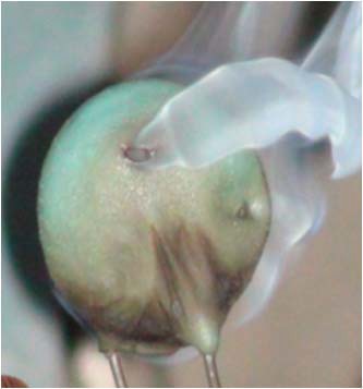 圖13:TMOV10S471 在600V*0.5A 電流試驗(yàn)后圖片 圖14:TMOV10S471 在600V*2.5A 電流試驗(yàn)后圖片