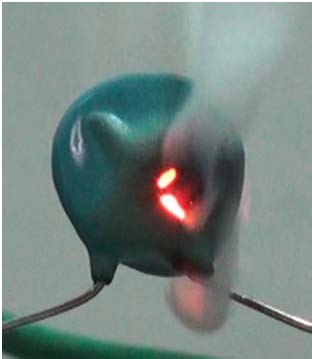a、老化失效,這是指電阻體的低阻線性化逐步加劇,漏電流惡性增加且集中流入薄弱點(diǎn),薄弱點(diǎn)材料融化,形成1kΩ 左右的短路孔后,電源繼續(xù)推動一個較大的電流灌入短路點(diǎn),形成高熱而起火。研究結(jié)果表明, 若壓敏電阻存在著制造缺陷,易發(fā)生早期失效, 強(qiáng)度不大的電沖擊的多次作用,也會加速老化過程,使老化失效提早出現(xiàn);