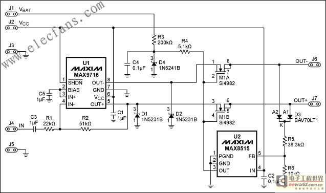 一個雙N溝道MOSFET斷開在回答有關(guān)任何輸出高電壓狀態(tài)下從線束放大器輸出。 MOSFET管(M1A及數(shù)M1B)一般上,用自己的驅(qū)動11V的齊納二極管的(4點)及其約11V的偏置元件。這種雙二極管D3提供了一個在每個輸出直流電壓二極管或連接,從而產(chǎn)生電壓,控制分流穩(wěn)壓器U2樂隊(MAX8515)輸出。所示的電路U1的保護,一個1.4W功率AB類放大器(MAX9716)以上(聲音警告和汽車的司機的跡象)中提到的應用場合。