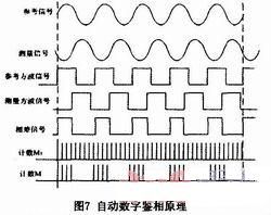 由于測量信號頻率較高,直接對其進行鑒相難以達到良好的鑒相精度,因而在系統(tǒng)中采用混頻的方法進行差頻鑒相。在差頻鑒相中,參考信號和測量信號同時與本振信號進行混頻,濾除混頻后高頻分量,得到混頻后低頻參考信號和混頻后低頻測量信號?;祛l降低了信號頻率,但保持相位差不變,便于鑒相操作。相位差的檢測使用自動數(shù)字鑒相法。其原理如圖7所示。參考信號和測量信號通過過零比較,得到參考方波信號和測量方波信號。比較兩方波信號,得到兩者之間的相位差信號,然后使用高頻計數(shù)脈沖對相位差信號,然后使用高頻計數(shù)脈沖對相位差信號進行計數(shù)。設(shè)參考信號和測量信號的周期為f,高頻計數(shù)脈沖的頻率為fc,一個周期內(nèi)的計數(shù)值為M,則相位差為:△φ=2πMf /fc。為了減小偶然誤差,提高鑒相精度,可以對多個周期計數(shù)求平均。設(shè)N個周期的計數(shù)值為M'',則△φ=2πM''f/Nfc。