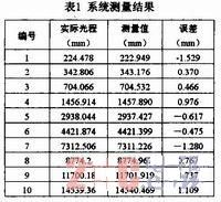 在實際測量中,利用組合測尺頻率先后進行兩次測量。第一次取主振信號頻率為52MHz,本振信號頻率為51.99MHz;第二次取主振信號頻率為51MHz,本振信號頻率為50.99MHz。對應(yīng)于混頻后信號頻率為10kHz。FPGA中鑒相高速計數(shù)脈沖頻率為50MHz?;谝陨蠀?shù),對多段光纖進行測量。兩次測量的結(jié)果進行分析比較,可得到測量值。被測光纖的實際光程已由精密反射儀通過光學(xué)方法進行標(biāo)定。測量結(jié)果如表1所示。