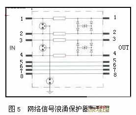 BAx系列信號(hào)浪涌保護(hù)器是專為通過(guò)雙絞線進(jìn)行信號(hào)傳輸?shù)脑O(shè)備而設(shè)計(jì),以保護(hù)其避免遭受感應(yīng)過(guò)電壓和操作過(guò)電壓的損害。該浪涌保護(hù)器輸入、輸出采用RJ45公/母于接頭串聯(lián)保護(hù)。網(wǎng)絡(luò)信號(hào)浪涌保護(hù)器原理圖見(jiàn)圖5所示。
