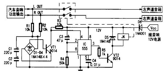 2.關(guān)閉音響電源時,+12電壓很快消失,但功放輸出信號并沒有立即消失,同樣避免了關(guān)機(jī)過程產(chǎn)生的沖擊噪聲;
