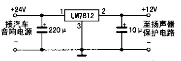 具體制作如下:先把功放輸出端與音箱的引線切斷,按圖2所示電路將引線頭a、b分別接功放的兩組輸出端,c、d分別接左、右聲道音箱:揚(yáng)聲器保護(hù)電路的電源只能從收放機(jī)中獲取,不可直接從汽車12 v電源中獲取,否則不起開/關(guān)機(jī)保護(hù)作用;若是柴油車所配置的收放機(jī)(使用24 V電源),則要求增加一個降壓電路(見圖3所示),給揚(yáng)聲器保護(hù)電路供電,以免電源電壓過高損壞IC。