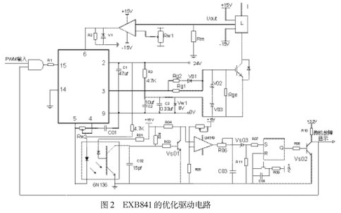 如圖2所示,用外接8V穩(wěn)壓管Vw1代替驅(qū)動(dòng)芯片內(nèi)部的穩(wěn)壓管Vz2,在穩(wěn)壓管兩端并聯(lián)了兩個(gè)電容值分別為105μf和0.33μf的去耦濾波電容。為防止柵極驅(qū)動(dòng)電路出現(xiàn)高壓尖峰,在柵射極間并聯(lián)了反向串聯(lián)的16V(V02)和8V(V03)穩(wěn)壓二極管。為了改善控制脈沖的前后沿陡度和防止震蕩,減小IGBT 集電極的電壓尖脈沖,需要在柵極串聯(lián)電阻Rg。柵極串連電阻Rg要恰當(dāng),Rg過(guò)小,關(guān)斷時(shí)間過(guò)短,關(guān)斷時(shí)產(chǎn)生的集電極尖峰電壓過(guò)高;Rg過(guò)大,器件的開(kāi)關(guān)速度降低,開(kāi)關(guān)損耗增大。優(yōu)化電路采用了不對(duì)稱(chēng)的開(kāi)啟和關(guān)斷方法。在IGBT開(kāi)通時(shí),EXB841的3腳提供+16V的電壓,電阻Rg2經(jīng)二極管Vd1和Rg1并聯(lián)使Rg值較小。關(guān)斷時(shí),EXB841內(nèi)部的V5導(dǎo)通,3腳電平為0,優(yōu)化驅(qū)動(dòng)電路在IGBT的E極提供-8V電壓,使二極管V01截止,Rg= Rg1具有較大值。并在柵射極間并聯(lián)大電阻,防止器件誤導(dǎo)通。