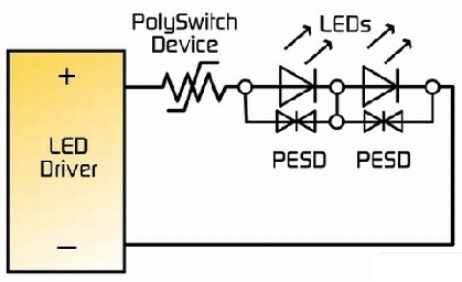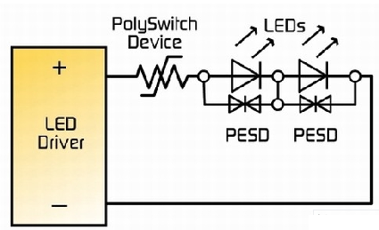 如圖1所示,PolySwitch LVR元件可以同電源輸入串聯(lián)安裝,以幫助避免由短路,超載電路或者用戶濫用所造成的破壞。此外,橫置于輸入端的金屬氧化物變阻器(MOV)幫助在LED模型中提供過(guò)壓保護(hù)。