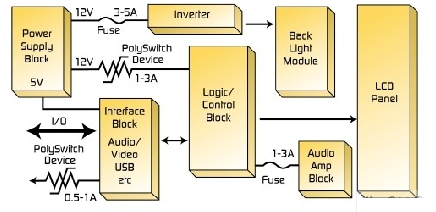 圖3顯示了在LCD電視監(jiān)測(cè)器中PolySwitch元件可以安放的位置,以幫助提供過(guò)電流保護(hù)。為了充分發(fā)揮PolySwitch元件的影響,可以將其和金屬芯電路板或者LCD散熱片熱結(jié)合在一起。如果LCD沒(méi)有內(nèi)置的ESD保護(hù),可以向ESD并聯(lián)一個(gè)PESD保護(hù)元件,以幫助避免由ESD電壓浪涌造成的破壞。