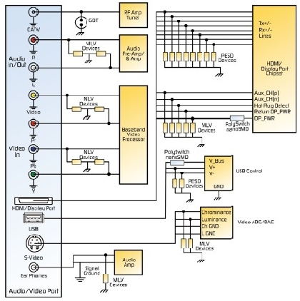 圖4. 典型的運(yùn)用MLV元件, PESD抑制元件以及PolySwitch過(guò)電流保護(hù)元件的顯示端口電路保護(hù)設(shè)計(jì)