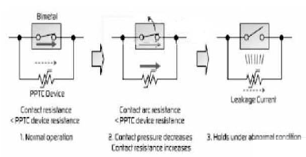 由于雙金屬觸點的低接觸阻抗,在正常操作下電流會流經(jīng)雙金屬觸點。當出現(xiàn)諸如電動工具轉子鎖定這樣的異常事件時,電路中就會產生更高的電流,使雙金屬觸點打開,其接觸電阻也隨之升高。此時,電流就會分流到具備更低阻抗的PPTC器件上,同時也加熱雙金屬,使其打開并保持在鎖定的狀態(tài), 從而有助于防止各觸點之間電弧的產生。請參考圖2。