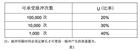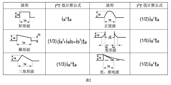 脈沖產(chǎn)生熱循環(huán),從而產(chǎn)生機械疲勞影響保險絲管壽命。設計時應使脈沖I2T遠遠小于保險絲管標稱熔化熱能I2T。保險絲管壽命(可承載的脈沖循環(huán)次數(shù))與U(脈沖I2T值之比率)的關系參照表1.本目錄提供的各種規(guī)格的保險絲管熔化熱能I2T可供參考,表2提供各種典型脈沖波形的I2T值近似計算公式: