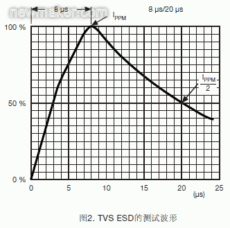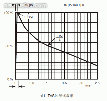 TVS的額定功率是在一定測試或應(yīng)用條件下吸收浪涌的能力。10μs/1000μs脈沖波形的工業(yè)標準測試條件(Bellcore 1089標準)如圖1所示。這個測試條件不同于8μs/20μs脈沖波形的TVS瞬態(tài)電壓吸收能力測試條件,如圖2所示。
