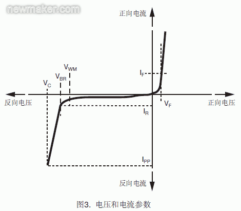 在特定的峰值脈沖電流定額下,TVS上會出現(xiàn)鉗位電壓。TVS的擊穿電壓在非常小的電流下測得(例如1mA或10mA),它不同于應(yīng)用條件下的實際雪崩電壓。因此,半導(dǎo)體制造商所標注的是在大電流下的典型或最大擊穿電壓。