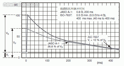 兩個熟知的試驗?zāi)M了這個條件:針對14V動力總成的美國ISO-7637-2 Pulse 5和日本JASO A-1和針對27V動力總成的JASO D-1。在本節(jié)中,我們將回顧在14V動力總成中用于甩負荷的TVS應(yīng)用。