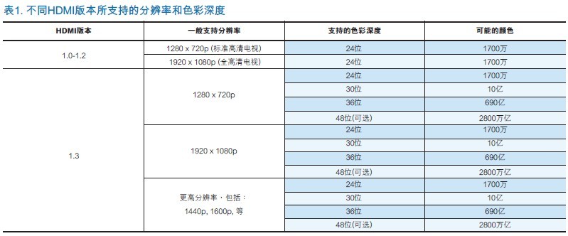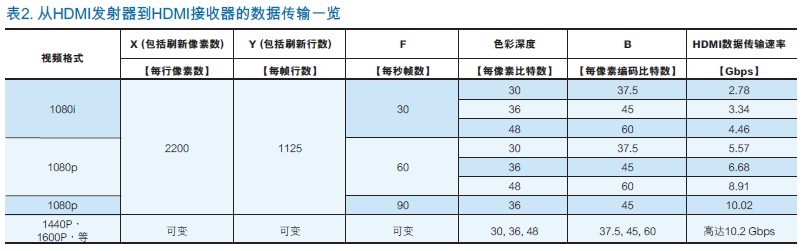 表1顯示了每種分辨率和相應的每行像素和每幀行數(shù)。對於表1列出的每一個色深,都有一個相應的為每個像素顏色而傳輸?shù)木幋a比特數(shù)。需要從HDMI發(fā)射器發(fā)送至HDMI接收器的數(shù)據(jù)量可以被解釋為這些變量之間的關係,包括更新屏幕所需的幀數(shù)。表2描述了這種關係: