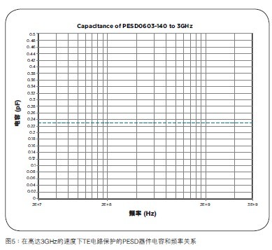 如圖5所示,TE電路保護的PESD器件在3GHz速度下具有穩(wěn)定的電容和頻率關係。其行為非常類似於一個0.25pF(典型值)的電容,從而可以大大簡化設計。由於HDMI的TMDS對根據(jù)數(shù)據(jù)模式,視頻源的分辨率和色彩深度改變運行頻率,瞭解ESD保護器件的電容在很寬的頻率范圍內是穩(wěn)定的特點可以為設計人員提供更多的自由度和靈活性。