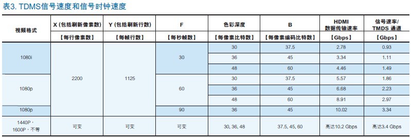 為了說明鏈路數(shù)據(jù)速率和物理TMDS對之間的關係,表3結合了表2中的信息與TMDS對信號速度,以及相應的信號時鐘速度。