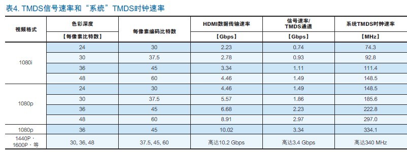因而信號時鐘和數(shù)據(jù)傳輸率相當於“系統(tǒng)”TMDS時鐘速率的十倍。此外,對於更高的色彩深度,信號時鐘速率會更高,以適應傳輸更多每像素編碼比特數(shù)。表4中描述了鏈路數(shù)據(jù)速率、TMDS信號速率和“系統(tǒng)”TMDS時鐘速率之間的關係。