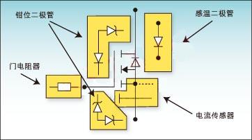 突出顯示的元件組成一個(gè)特性板,可以將其中的功能集成到MOSFET中。這些元件從右上角開(kāi)始按順時(shí)針?lè)较驗(yàn)椋簻囟雀袘?yīng)二極管、電流傳感器、鉗位二極管(內(nèi)部二極管,未顯示)和門電阻器。通過(guò)加入鉗位二極管和門電阻器眾所周知的保護(hù)特性,可以保護(hù)對(duì)電壓敏感的柵氧化層免受危險(xiǎn)電場(chǎng)的破壞。