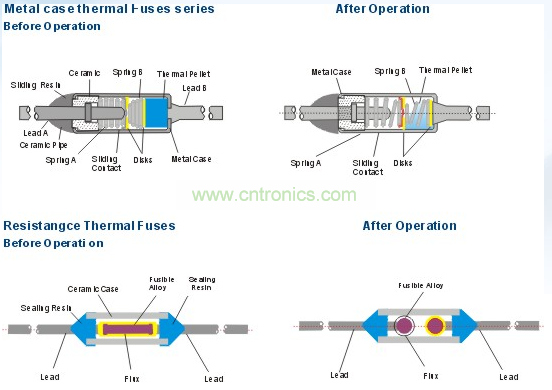 當(dāng)溫度保險(xiǎn)絲周圍溫度上升到它的動作溫度時(shí),其易熔合金熔化并在表面張力作用下及特殊樹脂幫助作用下,收縮成球狀附兩引腳未端或保險(xiǎn)絲內(nèi)彈簧的彈力推走電極作用,這樣電路被切斷