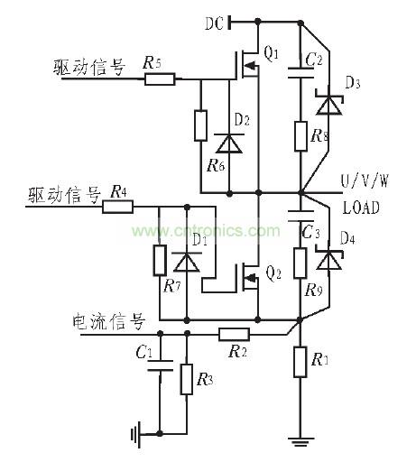 當(dāng)電流過(guò)大或者發(fā)生短路時(shí),功率MOSFET漏極與源極之間的電流會(huì)迅速增加并超過(guò)額定值,必須在過(guò)流極限值所規(guī)定的時(shí)間內(nèi)關(guān)斷功率MOSFET,否則器件將被燒壞,因此在主回路增加電流采樣保護(hù)電路,當(dāng)電流到達(dá)一定值,通過(guò)保護(hù)電路關(guān)閉驅(qū)動(dòng)電路來(lái)保護(hù)MOSFET管。圖1是MOSFET管的保護(hù)電路,由此可以清楚的看出保護(hù)電路的功能。