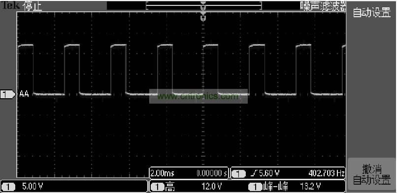 在實(shí)際應(yīng)用中柵極的驅(qū)動(dòng)波形如圖4所示,此波形是在電機(jī)3000RPM時(shí)的驅(qū)動(dòng)波形,可以看出此波形完全能夠滿足要求,同時(shí)進(jìn)行了短路、電機(jī)堵轉(zhuǎn)等試驗(yàn),圖3電路也能過(guò)很好地保護(hù)功率MOSFET管。