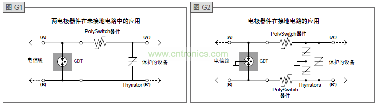 失效保護(hù)機(jī)構(gòu)是安裝在位于氣體放電管中心電極焊塊上的短路簧片。如圖G12所示,在正常的工作條件下,焊塊使得彈簧片浮在外側(cè)電極之上。當(dāng)長時(shí)間放電使氣體放電管溫度達(dá)到焊塊的熔點(diǎn)時(shí),焊塊就會(huì)被軟化,促使短路彈片被激活,并與兩個(gè)外側(cè)電極搭接。這個(gè)過程導(dǎo)致三個(gè)電極之間永久短路,建立起一條低阻抗路徑,將故障電流引到地面,而不會(huì)產(chǎn)生顯著的熱量。