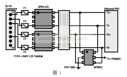 任何線路端保護(hù)裝置(這個例子中的 SP03A)不能有 GND引腳(2、3、6 和 7)連接到 GND,以保證符合 IEEE802.3隔離標(biāo)準(zhǔn);因此,設(shè)計師沒有選擇,只能將此設(shè)備作為“異模”保護(hù)器。(注:當(dāng)然,這使得驅(qū)動端保護(hù)元件成為必要,以保護(hù)系統(tǒng)免受共模事件損壞。)