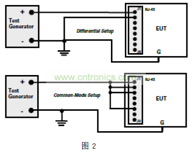 檢查設(shè)備的 EFT 免疫力(根據(jù) IEC61000-4-4 標(biāo)準(zhǔn)),與共模雷擊浪涌測試非常相似。在如圖 3 所示比較典型的配置中,所有的導(dǎo)體(或引腳)電容耦合到測試信號發(fā)生器的正極和“浪涌”到 GND。如果數(shù)據(jù)線幾乎沒有差別,線對之間很少有異模能量,但變壓器耦合電容會再次將共模能量以衰減的方式傳輸?shù)津?qū)動端。