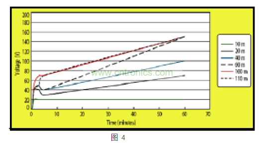 隨之而來的高能量放電可能會損壞連接器,變壓器電路,或以太網(wǎng)收發(fā)器。雙絞線電纜表現(xiàn)像一個存儲電荷的電容器。有研究證明,未連接到終端的雙絞線電纜可能會積累幾百伏的電荷。此外,在一個小時內(nèi),完全放電的電纜可以積累其所能積累總電荷的一半。一旦有了靜電,高品質(zhì)的電纜保留其所帶靜電的時間可以超過 24 小時。下面圖 4展示了不同長度的 CAT5 電纜積累靜電如何隨著時間而變化。由于較長的電纜有容量來存儲更多的電荷,電纜長度超過 60m 的系統(tǒng)應(yīng)采取額外的 CDE 預(yù)防措施。