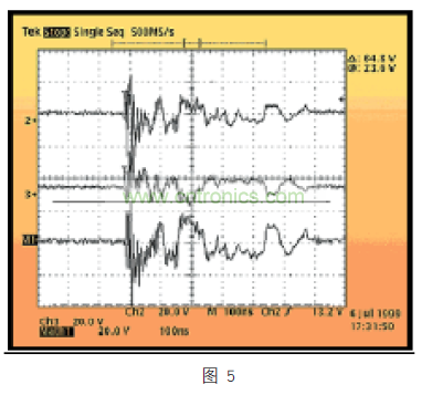 另一個要了解的重要因素是 CDE 波形,因為它不像以前討論的任何威脅,取決于耦合機制,要么是異模,要么是共模。此外,初步研究顯示,它在特點上有很大差異,但總體上看,CDE 的波形能量高,體現(xiàn)在電壓和電流驅(qū)動上。波形傳播的時間為幾百納秒,能夠快速反轉(zhuǎn)極性。下面的圖 5,給出了破壞性 CDE 波形的例子,在一個以太網(wǎng) PHY 發(fā)射器引腳,一個 25 英尺雙絞線電纜靜電電壓達(dá) 1.5KV。在該事件發(fā)生超過 600ns 時間的期間,在異模波形上看到有 64.8V 從正電壓轉(zhuǎn)換為負(fù)電壓。在這個實驗中,PHY 的發(fā)射器被破壞,無法在網(wǎng)絡(luò)上傳輸數(shù)據(jù)包。