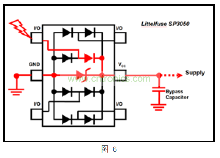 通過連接 SP3050的 VCC 引腳,由于電氣瞬態(tài)兩個獨立的放電路徑,如下(圖 6)紅色所示,設(shè)計者將更好進(jìn)行夾緊設(shè)計??梢院唵蔚貙⑺醋饕粋€電阻分壓器,其中瞬態(tài)電流通過導(dǎo)向二極管,并選擇了兩條路,一個通過內(nèi)部 TVS到 GND,一個通過電源或外部旁路電容到 GND??偠灾?5 腳連接到電源,將導(dǎo)致更好的夾緊性能,給以太網(wǎng) PHY 提供更好的整體保護(hù)。