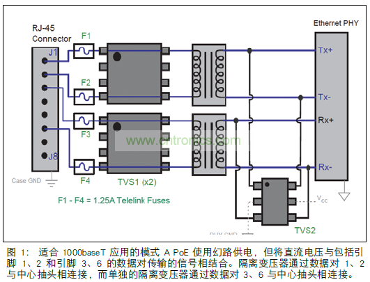 雷擊引起的電涌事件在幾納秒內(nèi)激活 TVS 二極管陣列TVS1,提供鉗位功能,將突如其來(lái)的電涌引離敏感的以太網(wǎng)線路驅(qū)動(dòng)器電路。 TVS2 將通過(guò)變壓器耦合的所有殘余電涌鉗位。 對(duì)于更穩(wěn)健的方法,可以為每個(gè)線對(duì)使用 TVS二極管陣列;否則,一個(gè) TVS 陣列可以保護(hù)兩個(gè)線對(duì),如同 TVS2 那樣。 涉及長(zhǎng)期 50- 和 60-Hz 波形的電源故障事件,在 TVS 設(shè)備提供電流路徑之后,激活 1.25A 保險(xiǎn)絲 F1至 F4。