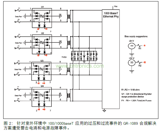 數(shù)據(jù)對(duì)導(dǎo)線中的保險(xiǎn)絲提供必要的過(guò)流保護(hù),對(duì)一級(jí) GR-1089 事件的雷擊引起的過(guò)壓電涌不敏感。 雙向半導(dǎo)體晶閘管電涌保護(hù)設(shè)備 IC1 至 IC4 或 SIDACtor設(shè)備(參見(jiàn)圖3.)提供過(guò)壓消弧保護(hù)方法,根據(jù) GR-1089 第 6 版,這種方法符合一級(jí)和二級(jí)雷擊電涌。