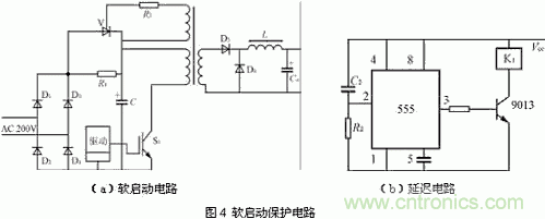 開關(guān)穩(wěn)壓電源的電路比較復雜,開關(guān)穩(wěn)壓器的輸入端一般接有小電感、大電容的輸入濾波器。在開機瞬間,濾波電容器會流過很大的浪涌電流,這個浪涌電流可以為正常輸入電流的數(shù)倍。這樣大的浪涌電流會使普通電源開關(guān)的觸點或繼電器的觸點熔化,并使輸入保險絲熔斷。另外,浪涌電流也會損害電容器,使之壽命縮短,過早損壞。為此,開機時應該接入一個限流電阻,通過這個限流電阻來對電容器充電。為了不使該限流電阻消耗過多的功率,以致影響開關(guān)穩(wěn)壓器的正常工作,而在開機暫態(tài)過程結(jié)束后,用一個繼電器自動短接它,使直流電源直接對開關(guān)穩(wěn)壓器供電,這種電路稱之謂直流開關(guān)電源的 “ 軟啟動 ” 電路。如圖 4 ( a )所示在電源接通瞬間,輸入電壓經(jīng)整流橋( D1 ~ D4 )和限流電阻 R1 對電容器 C 充電,限制浪涌電流。當電容器 C 充電到約 80 %額定電壓時,逆變器正常工作.經(jīng)主變壓器輔助繞組產(chǎn)生晶閘管的觸發(fā)信號,使晶閘管導通并短路限流電阻 R1,開關(guān)電源處于正常運行狀態(tài).為了提高延遲時間的準確性及防止繼電器動作抖動振蕩,延遲電路可采用圖 4 ( b )所示電路替代 RC 延遲電路.。