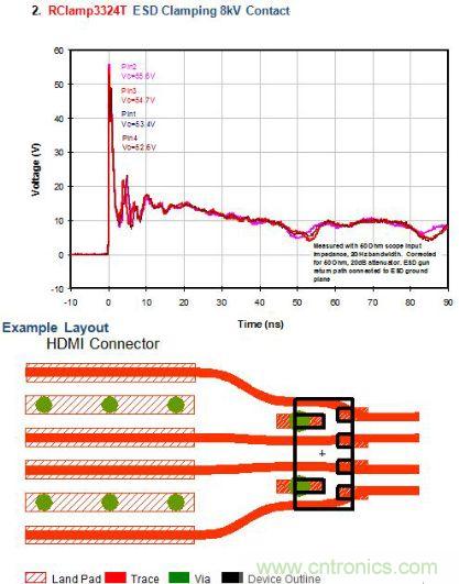 為此Semtech 作為TVS制造的領先者,推出了新的TVS,RClamp3324T,它都具有0.3pF的低電容,在USB3.0的應用中,不影響信號完整性,它最大的優(yōu)勢在于非常低的ESD鉗位電壓(在8KV 接觸靜電條件下,鉗位電壓在60V以下),這對敏感的USB3.0芯片起到很好的保護作用。