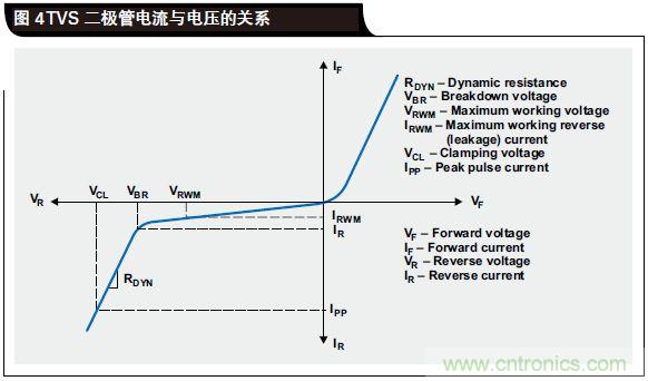 圖 4 顯示了 TVS 二極管電流與電壓特性的對(duì)比情況。盡管 TVS 是一種簡單的結(jié)構(gòu),但是在系統(tǒng)級(jí) ESD 保護(hù)設(shè)計(jì)過程中仍然需要注意幾個(gè)重要的參數(shù)。這些參數(shù)包括擊穿電壓 VBR、動(dòng)態(tài)電阻 RDYN、鉗位電壓 VCL 和電容。
