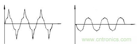 圖4中在開(kāi)啟或關(guān)閉帶有感性, 容性的負(fù)載電路時(shí), 直流波形出現(xiàn)開(kāi)關(guān)尖脈沖, 壓敏電阻將吸收這種反電動(dòng)勢(shì), 有效地保護(hù)開(kāi)關(guān)電路、變電壓。