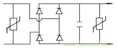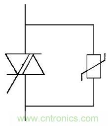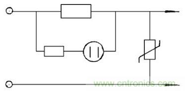 圖6中在特殊條件下使用的照明燈具, 要求極為嚴(yán)格, 采用了隔離變壓器, 這時(shí)壓敏電阻應(yīng)在隔離變壓器的初級(jí), 次級(jí)線圈繞組兩端同時(shí)使用壓敏電阻器, 它能吸收抑制來(lái)自輸入電壓的浪涌, 過(guò)壓雷擊或開(kāi)關(guān)引起的電火花干擾等。