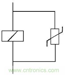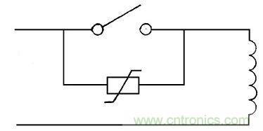 圖9中在繼電器、電磁鐵、磁力開(kāi)關(guān)、電磁閥門的線圈兩端并接壓敏電阻, 能吸收線圈兩端存貯的能量, 延長(zhǎng)線圈使用壽命, 防止頻繁開(kāi)關(guān)產(chǎn)生噪音的輻射。