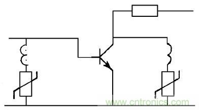 圖11在晶體管電路中, 三極管的e 極和b 極間, c級(jí)與b 級(jí)間帶有感性的負(fù)載兩端, 都可以并聯(lián)壓敏電阻; e 極與c 極接上壓敏電阻器, 能防止輸入過(guò)電壓雷擊損壞晶體管。當(dāng)所控制的負(fù)載屬感性的變壓器、鎮(zhèn)流器、電感、逆變器等, 在c 級(jí)與b 極間或者在負(fù)載線圈兩端并接壓敏電阻, 能有效地抑制電壓對(duì)晶體管的損傷。當(dāng)電路正常工作時(shí), 壓敏電阻處于高阻抗?fàn)顟B(tài), 而電路中產(chǎn)生過(guò)電壓時(shí), 壓敏電阻在毫微秒內(nèi)導(dǎo)通, 限制過(guò)電壓的幅度, 使晶體管免受損壞。