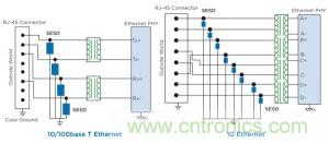 對于機頂盒設(shè)備上的 RJ45 端口,同樣考慮到因為頻繁插拔時由于靜電而導致的設(shè)備損害,在端口也可以增加上 SESD 器件來保護靜電干擾。圖4分別展示了在 10/100baseT 及 1G Ethernet 上使用 SESD 器件進行保護的應用。