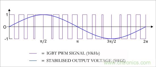 圖1:帶助推器和逆變器(頂部)的太陽能發(fā)電廠功能圖。每個(gè)IGBT驅(qū)動(dòng)器都有一個(gè)良好的帶隔離的DC/DC轉(zhuǎn)換器供電。設(shè)備通過一個(gè)高頻PWM信號控制,這個(gè)信號輸出平滑的正弦波(左)。