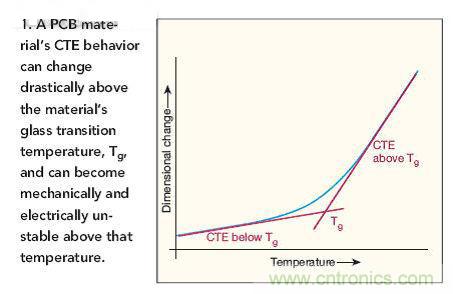 圖1:PCB材料的熱膨脹系數(shù)(CTE)特性在高于材料的玻璃化溫度Tg時會發(fā)生急劇變化,并且在機械和電氣方面變得不穩(wěn)定