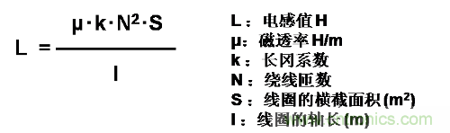 電感值的計算公式如下所示。卷數(shù)越多,磁場越強。同時,橫截面積變大,或改變磁芯都能夠使磁場增強。