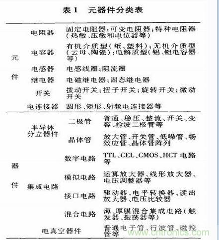 繼電器和開關(guān)等;器件可分為半導(dǎo)體分立器件、集成電路以及電真空器件等。表1為元器件分類表。