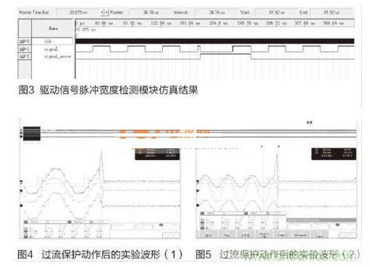 針對前文設(shè)計的驅(qū)動信號脈沖寬度檢測電路,通過仿真進行功能驗證,仿真結(jié)果如圖3所示,當(dāng)驅(qū)動信號(signal)脈沖過窄時,檢測模塊輸出高電平(signal_error)信號,意味著驅(qū)動信號的高電平信號脈寬小于預(yù)先設(shè)定的脈寬門限值上限,輸出高電平報警。