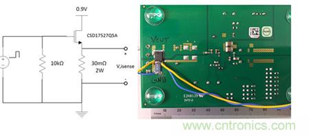 大多數(shù)電源評(píng)估模塊可以很容易地被配置為快速汲入電流的模式。圖1舉例說明了分立金屬氧化物半導(dǎo)體場(chǎng)效應(yīng)晶體管(MOSFET)加可直接從輸出平面焊接到接地裝置的檢測(cè)電阻器電路。選擇快速切換的低柵極電荷MOSFET以及能處理負(fù)載功率的低電感檢測(cè)電阻器至關(guān)重要。