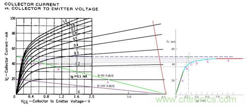 圖中假定電源電壓為4V,綠色的斜線是負載電阻為80歐姆的負載線,V/R=50MA,圖中標出了Ib分別等于0.1、0.2、0.3、0.4、0.6、1.0mA的工作點A、B、C、D、E、F。據(jù)此在右側(cè)作出了Ic與Ib的關(guān)系曲線。根據(jù)這個曲線,就比較清楚地看出“飽和”的含義了。曲線的綠色段是線性放大區(qū),Ic隨Ib的增大幾乎成線性地快速上升,可以看出β值約為200。蘭色段開始變彎曲,斜率逐漸變小。紅色段就幾乎變成水平了,這就是“飽和”。實際上,飽和是一個漸變的過程,蘭色段也可以認為是初始進入飽和的區(qū)段。在實際工作中,常用Ib*β=V/R作為判斷臨界飽和的條件。在圖中就是假想綠色段繼續(xù)向上延伸,與Ic=50MA的水平線相交,交點對應(yīng)的Ib值就是臨界飽和的Ib值。圖中可見該值約為0.25mA。
