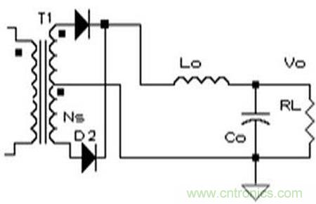 Q1關(guān)斷,Q2開通。此時(shí)變壓器兩端所加的電壓也基本上是母線電壓的一半,同時(shí)能量由原邊向副邊傳遞。副邊兩個(gè)二極管完成換流。