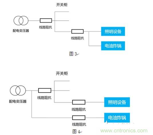 解決方法:發(fā)現(xiàn)問題后解決就比較簡單了,使大功率負(fù)載(電油炸鍋)單獨使用一條電纜后,問題解決,如圖3、圖4所示。